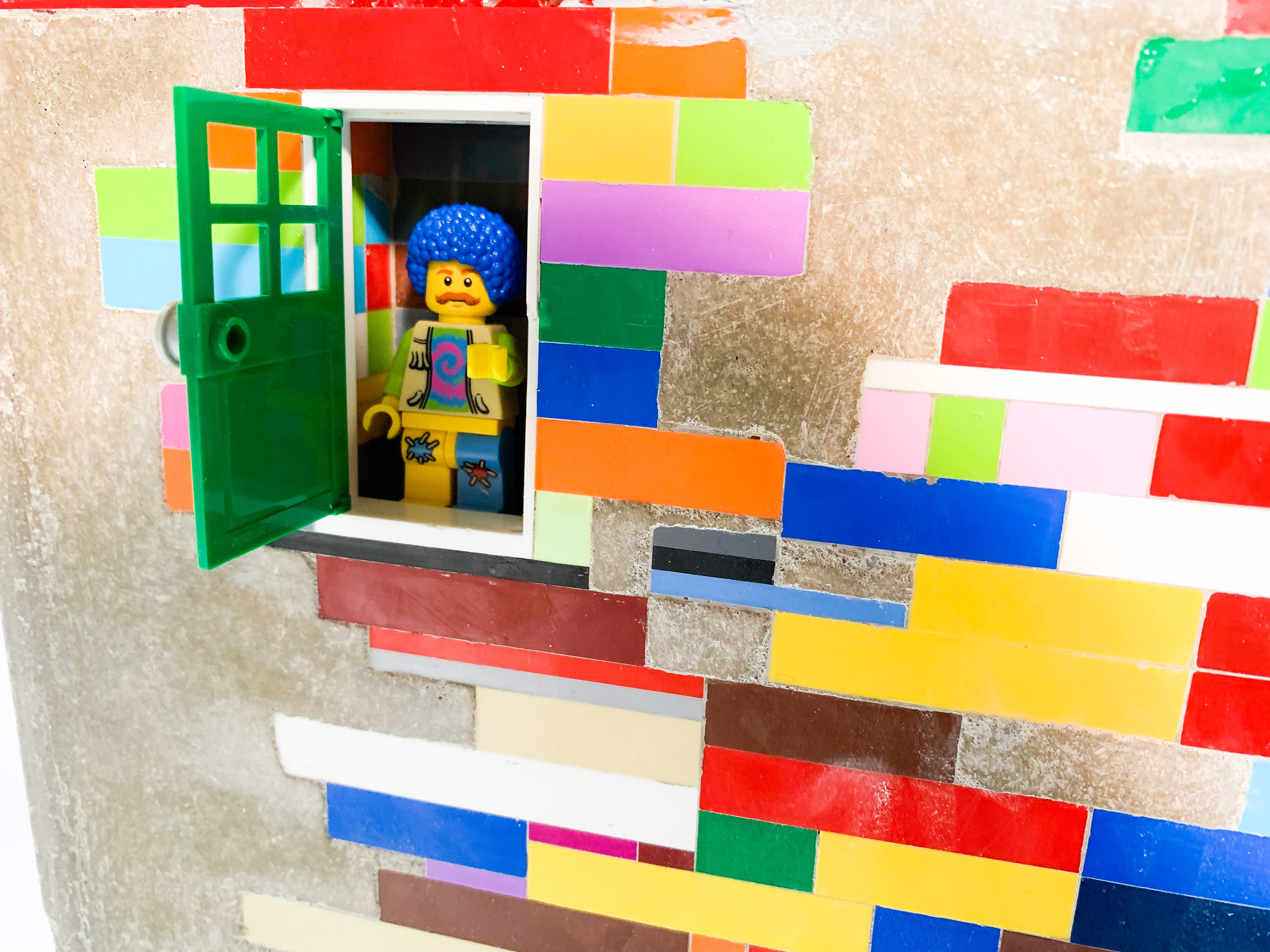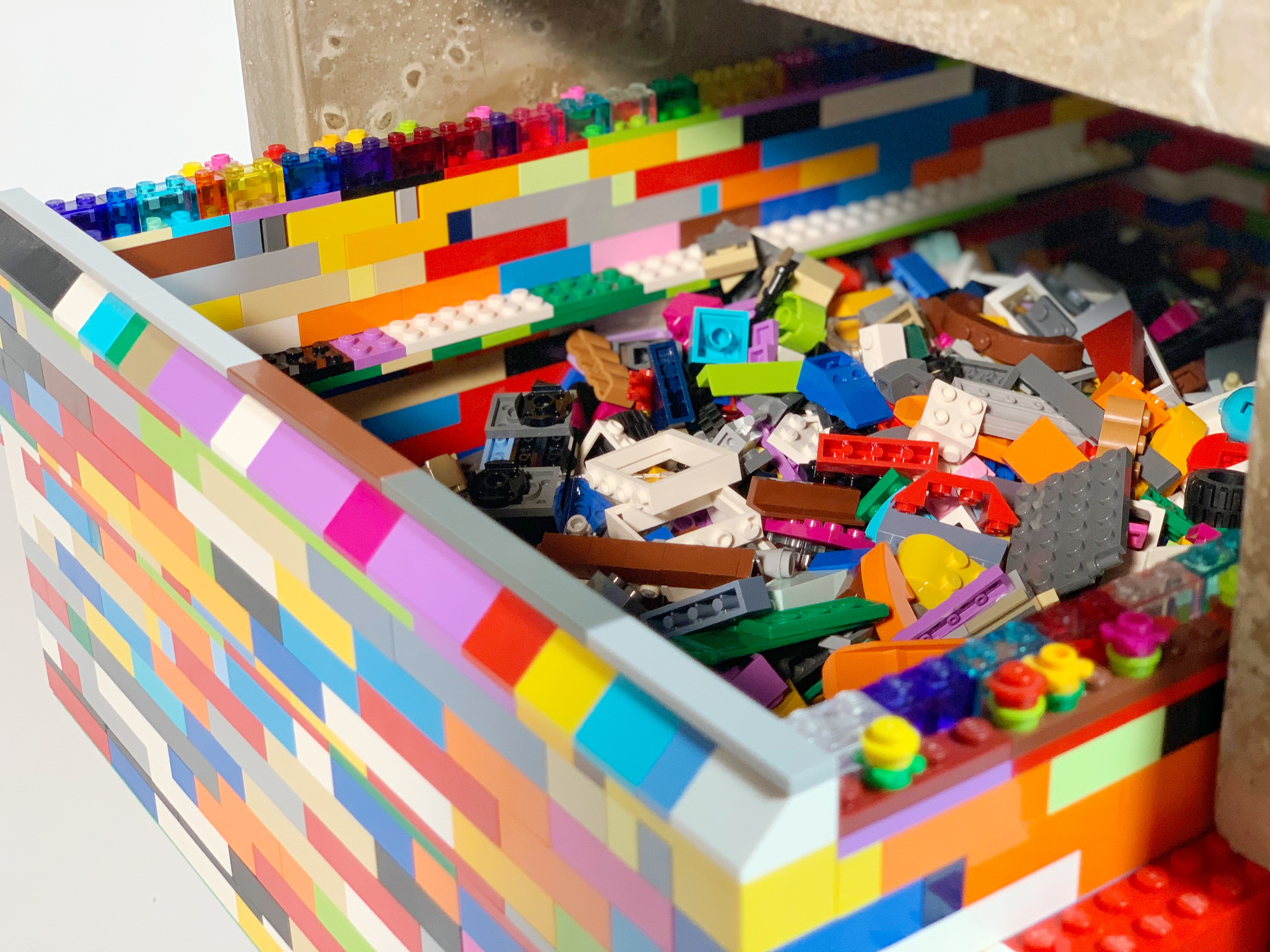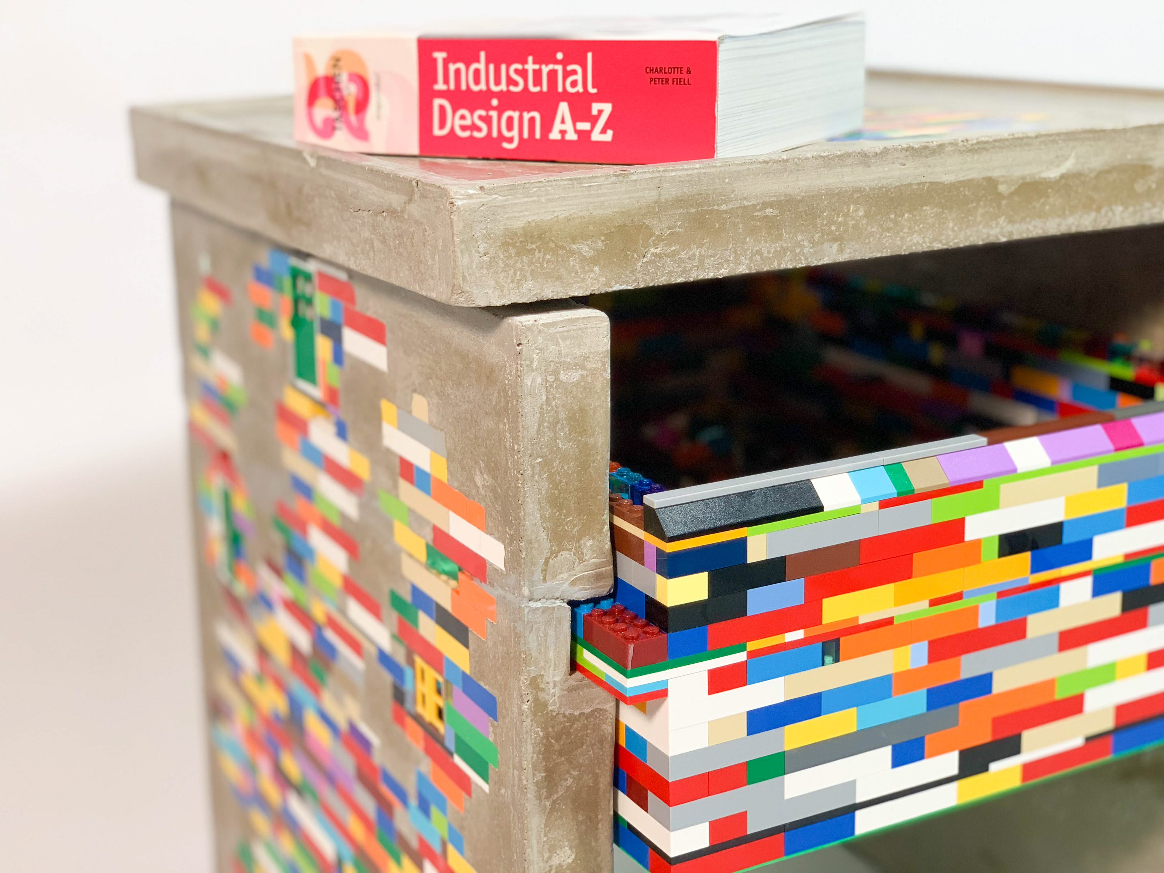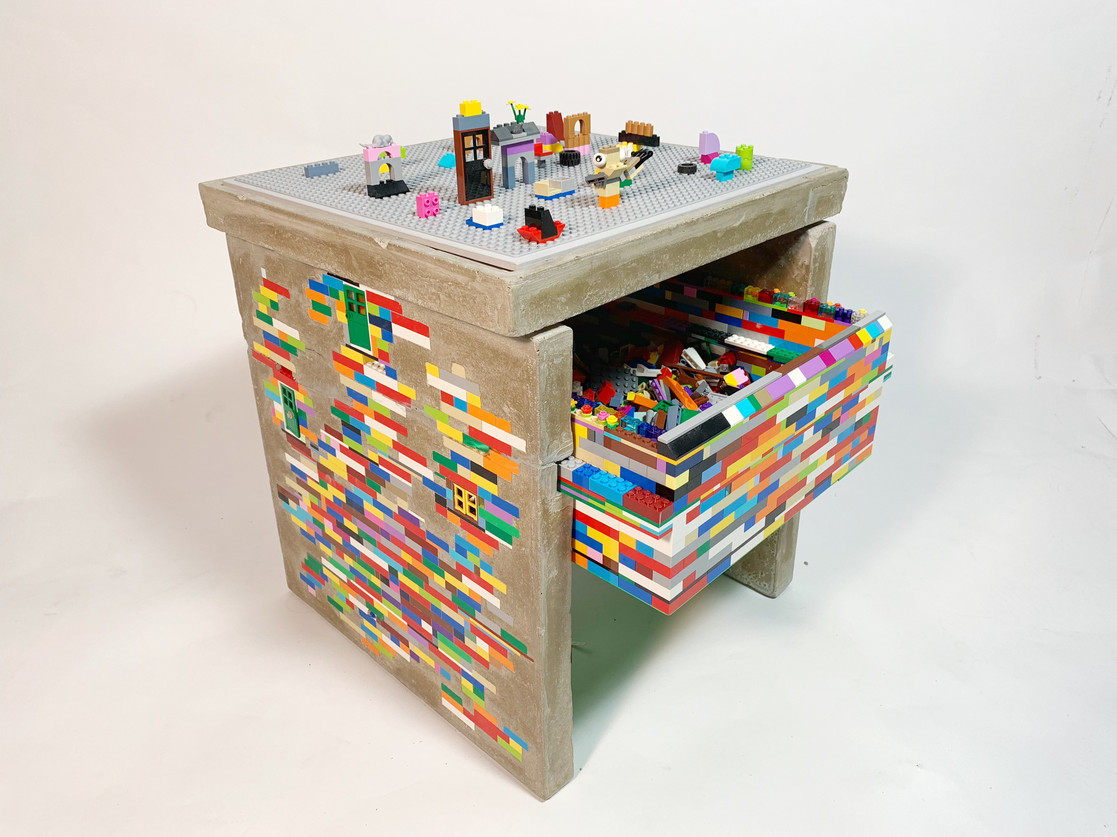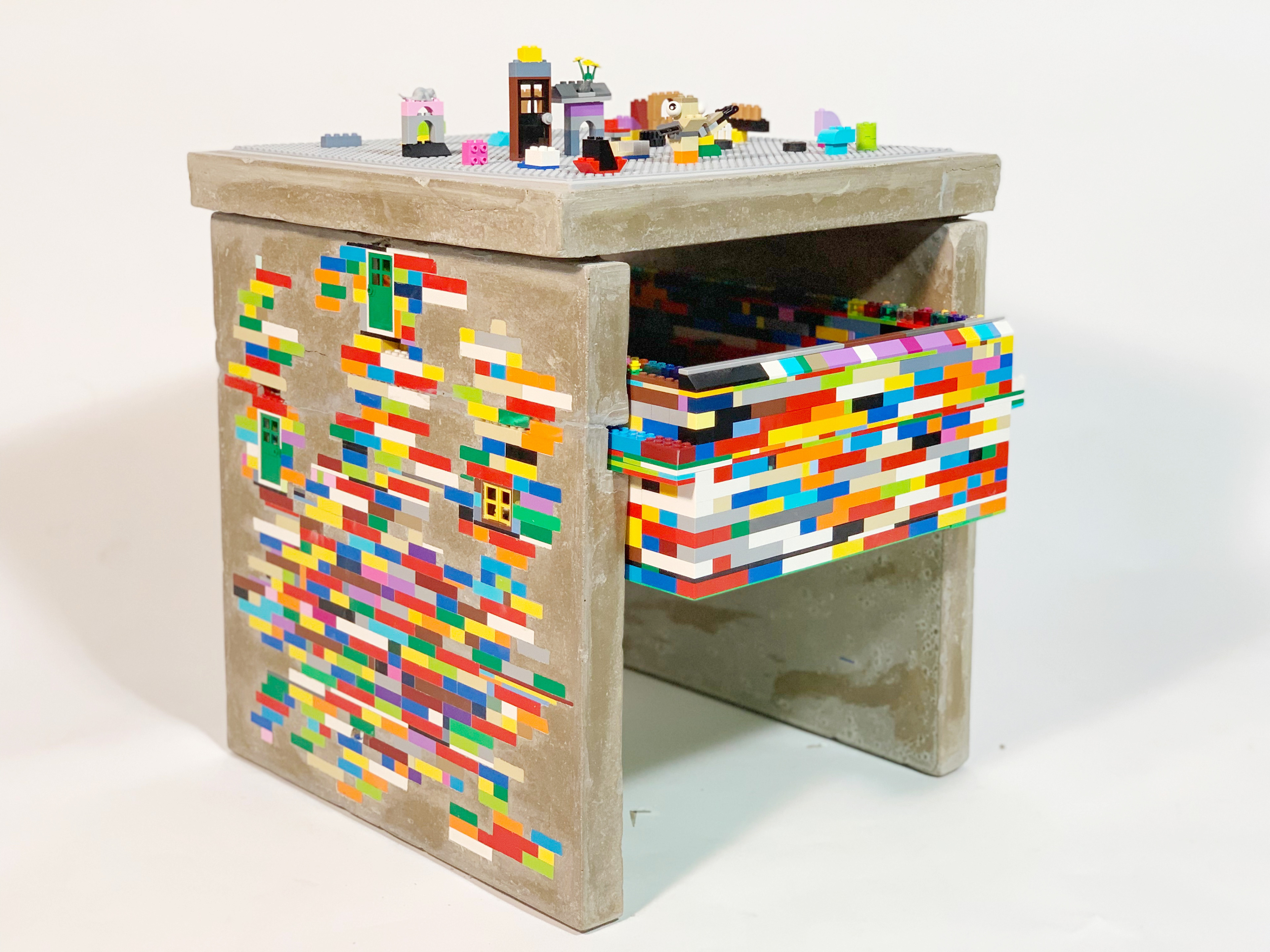 A small concrete side table with LEGO blocks integrated into the structure. Top baseplate and drawer are removable allowing users to build wherever they please. The drawer can store extra pieces and the users favourite creations.