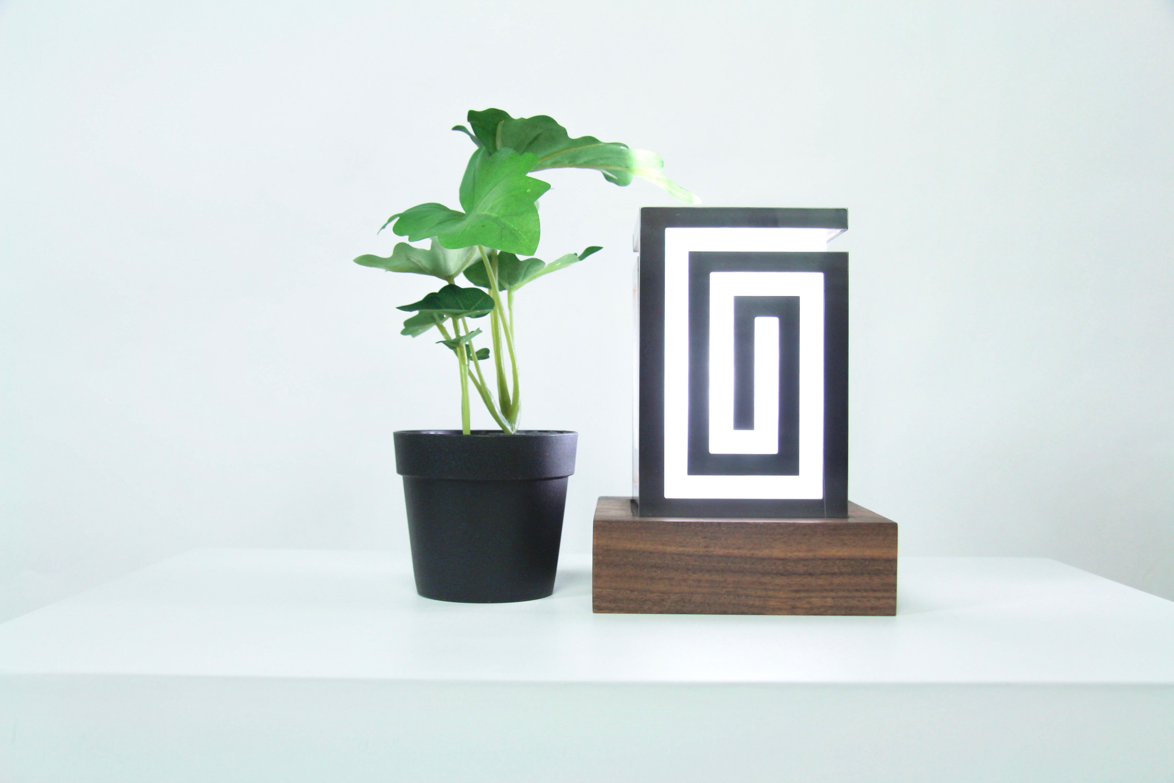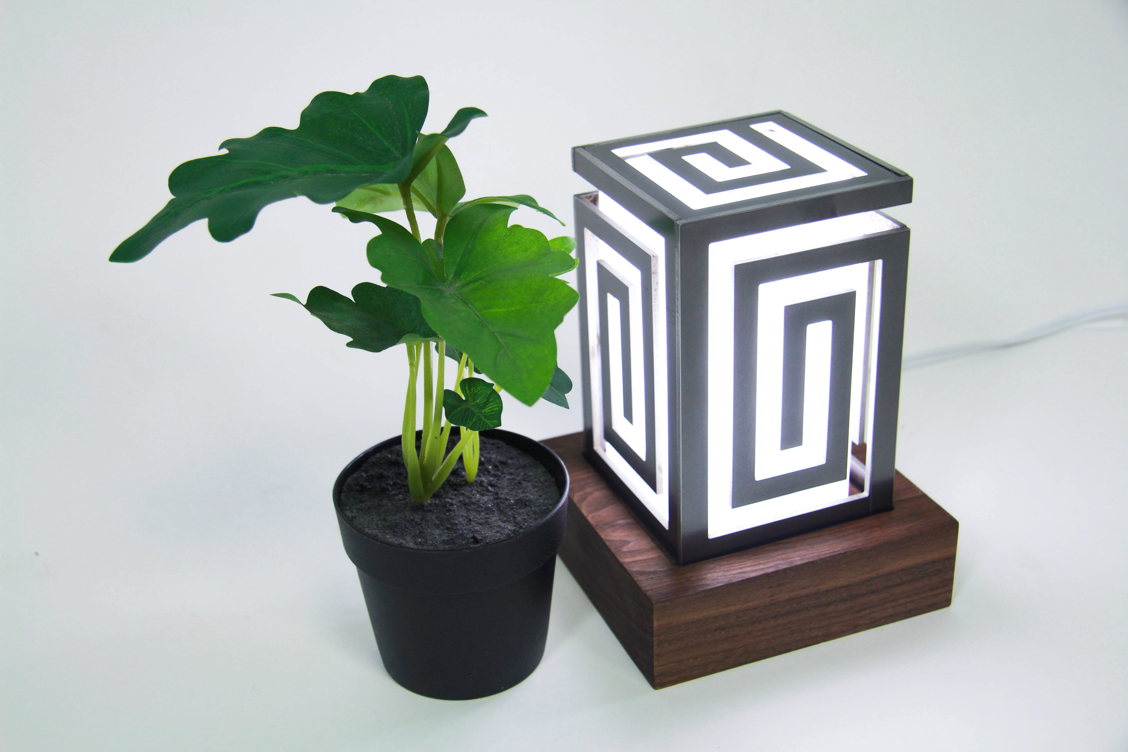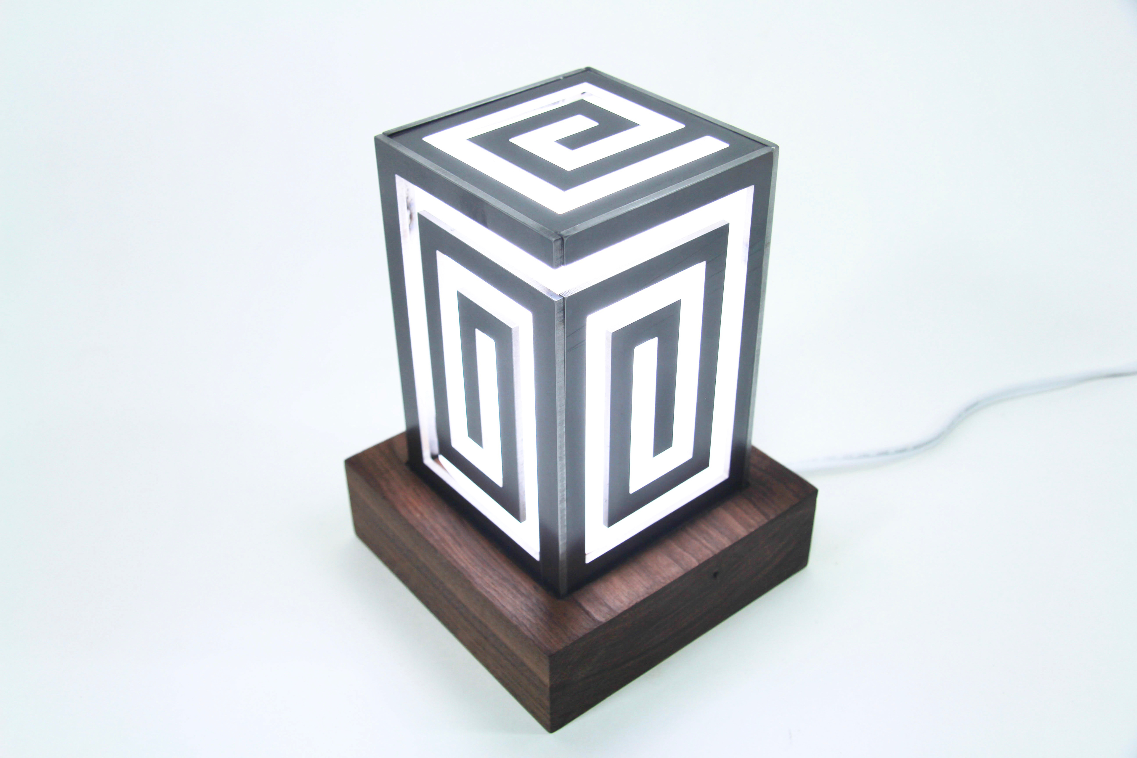 Mazelike lamp constructed from waterjet cut steel with a walnut base and rice paper lining.