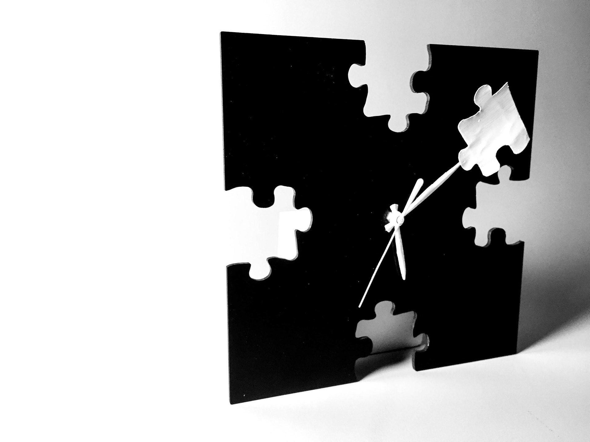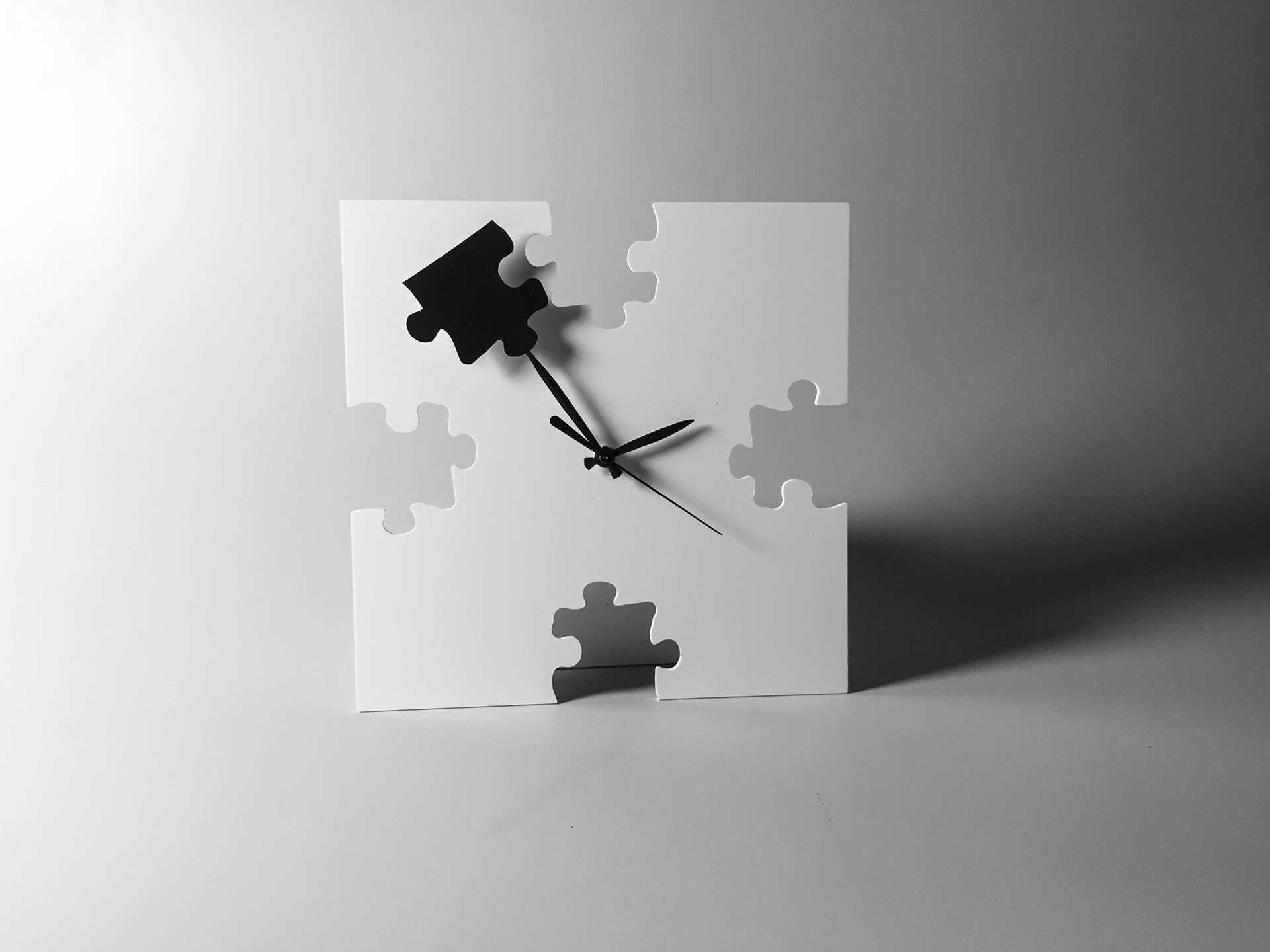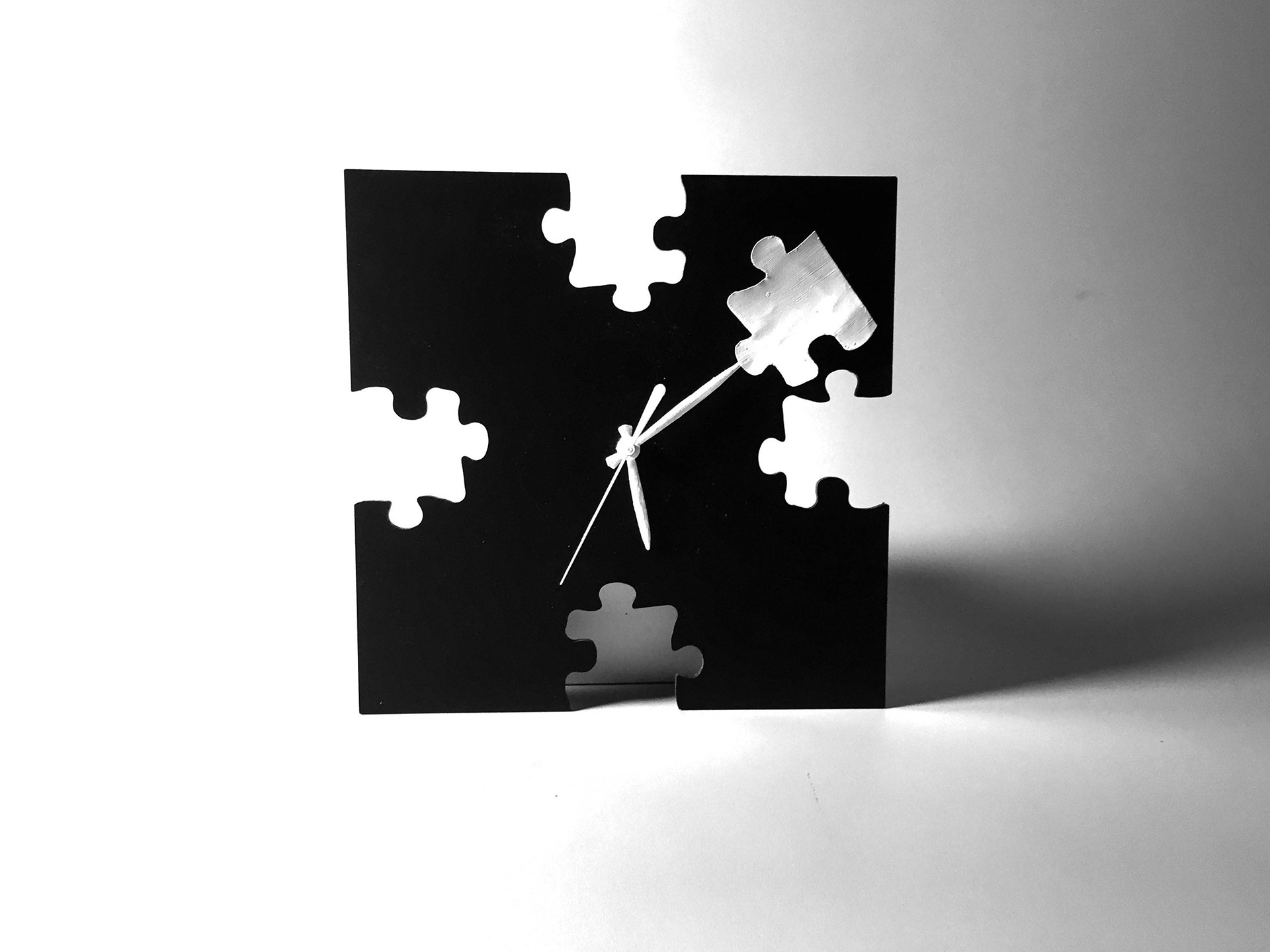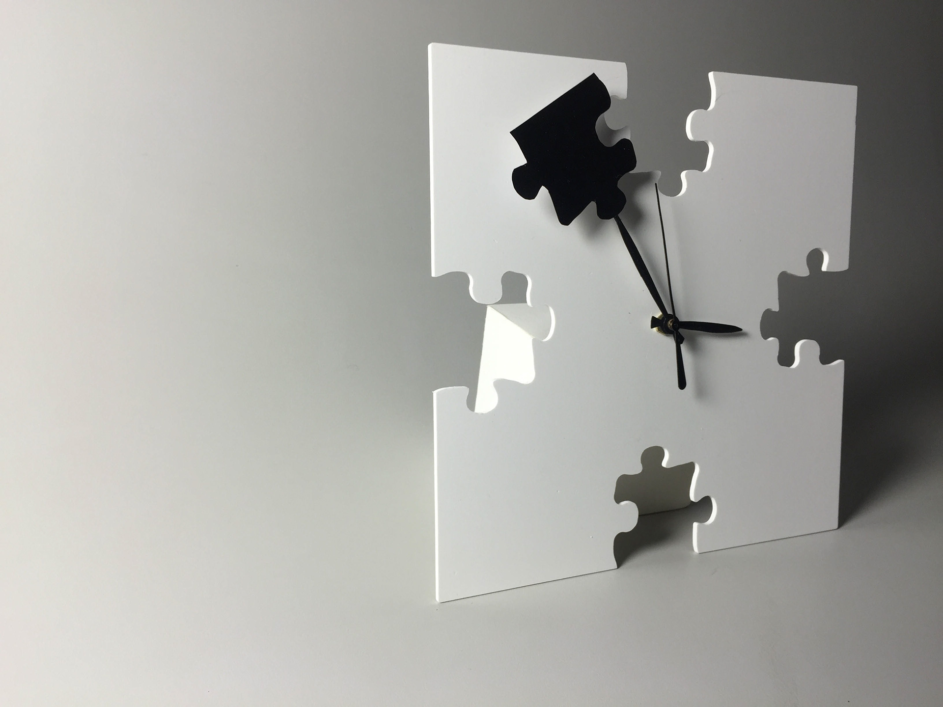Functioning chronograph inspired by the playful nature of puzzles. Produced using Sintra PVC.
