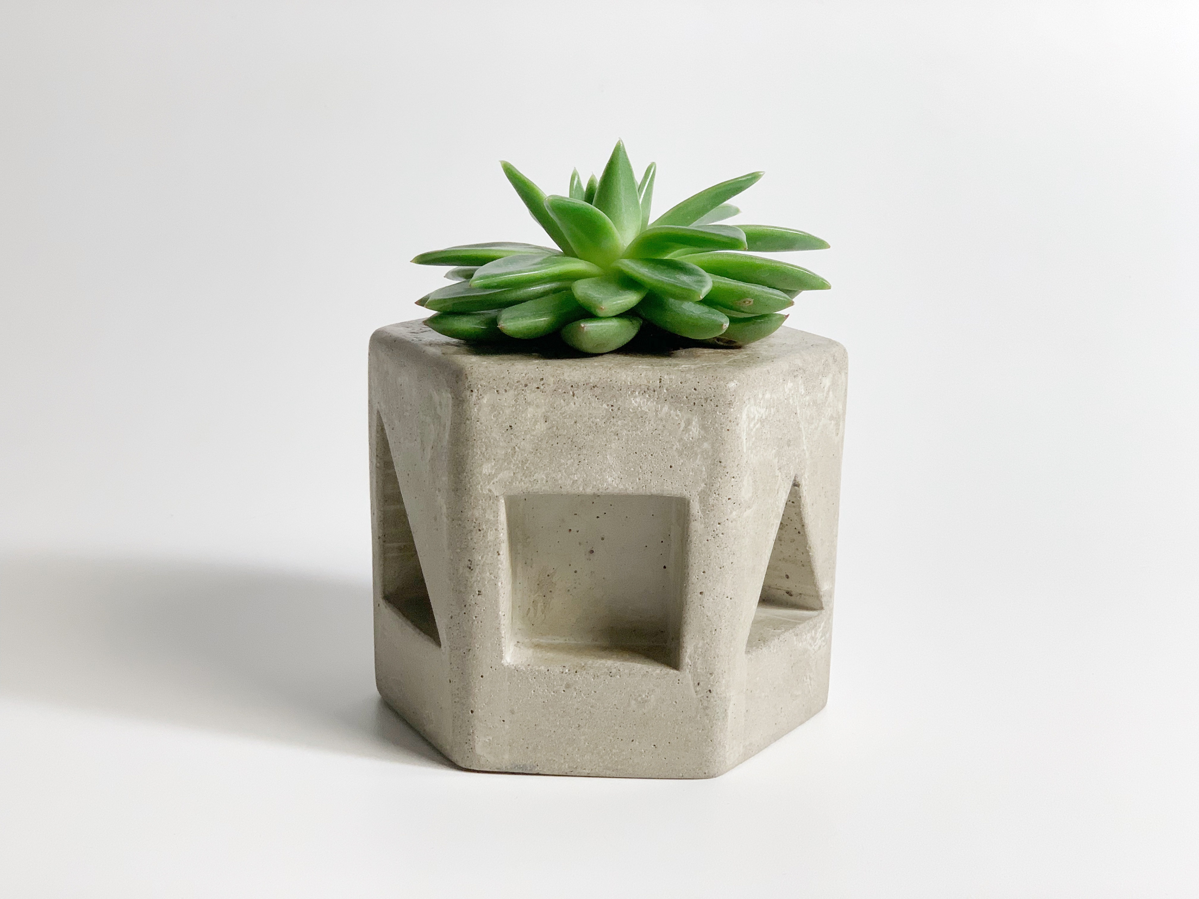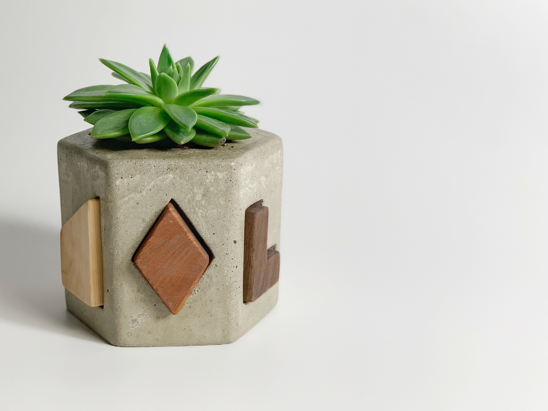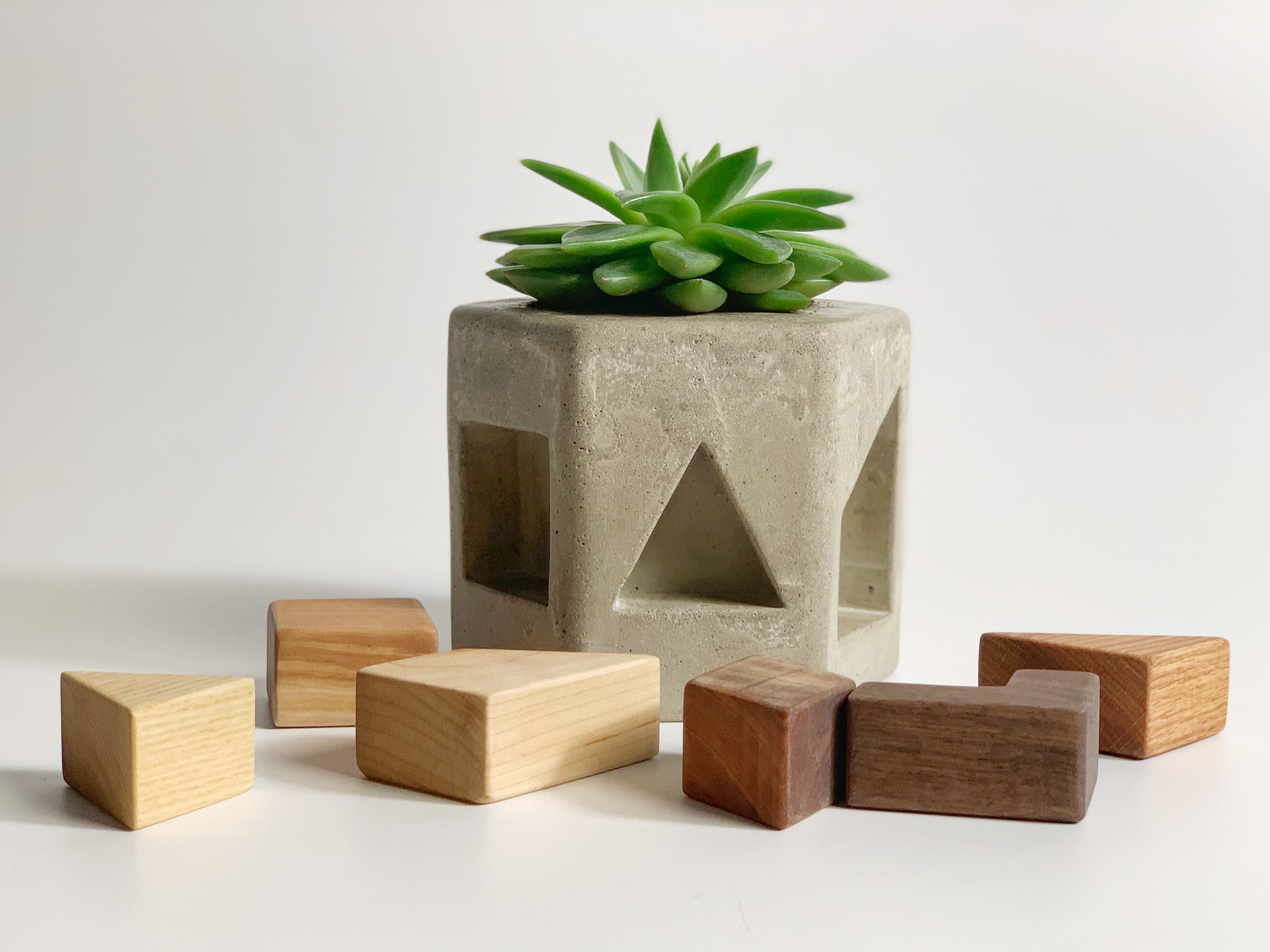 Playful concrete planter inspired by children's shape-matching toys. Each block comes from different species of wood, reflecting the uniqueness and individuality of the planter.